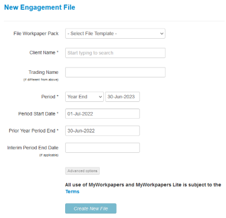 From there, select the appropriate workpaper pack, enter the client name, trading name (if applicable), and enter the file period. Check the box to accept the terms and conditions, and click Create New File.