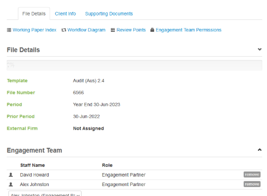 Note: If a staff member is restricted from certain actions in the file but has the required firm-level permission, ensure they have not been restricted in the engagement team role.
