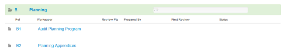 Once the steps above are completed, planning can begin. The Planning section is located in the "B" folder. This will differ for your firm if you have customised your template. To complete the planning section just tick to complete procedures and reference any supporting documents, adding comments when needed. For more information on completing programs, checklists and other workpapers click here.