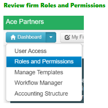 Roles and Permissions control which functions users can access, view and edit. Permissions are assigned to a role, then roles are assigned to users. Determine which of the standard roles apply to your firm, and edit the permissions for those roles. For detailed instructions on Roles and Permissions, click here.