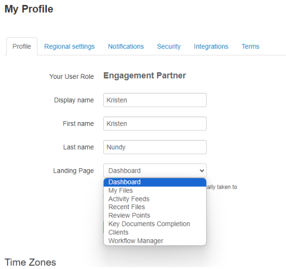 - Select the default screen you wish to be your landing page when you log in to MyWorkpapers;