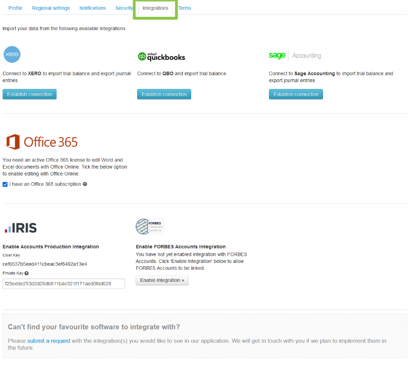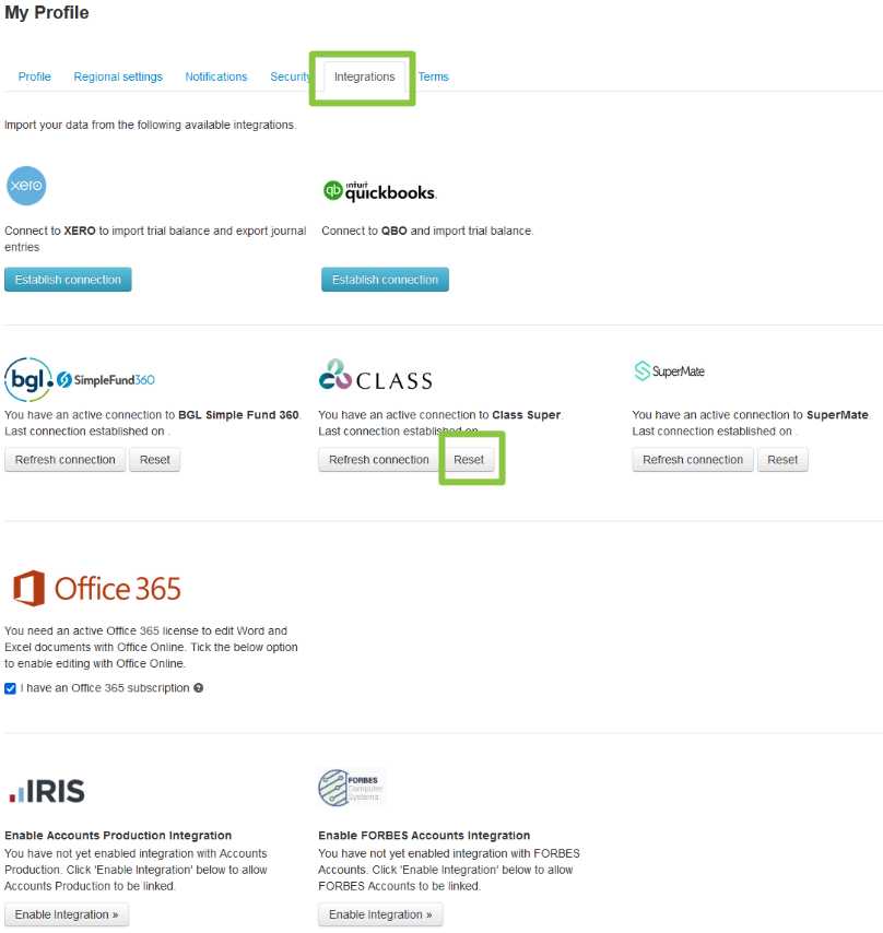 The integrations tab on your profile allows you to check your connections to our partner integrations and to establish or reset these connections where necessary.