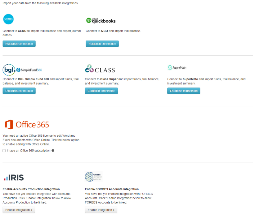 Note: You can also establish a connection to the cloud integrations during the Trial Balance import process.