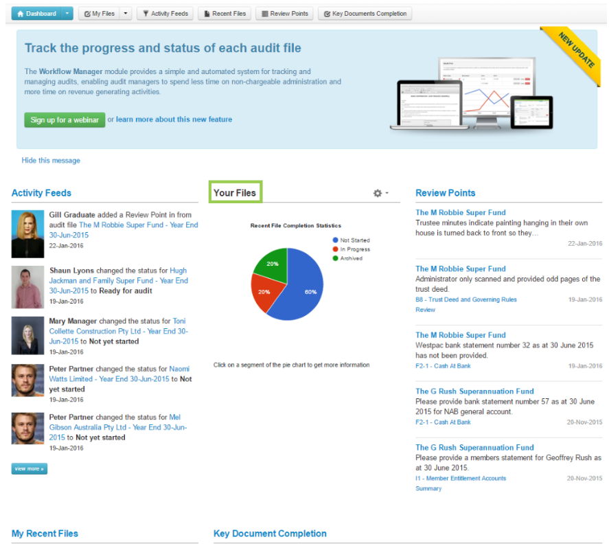 On your home dashboard, you will find a “Your Files” section tailored to you and your permissions. Depending on what permissions you have on MyWorkpapers, will determine whether you will see all files on the account or only files in which you are part of the engagement team in this graph.