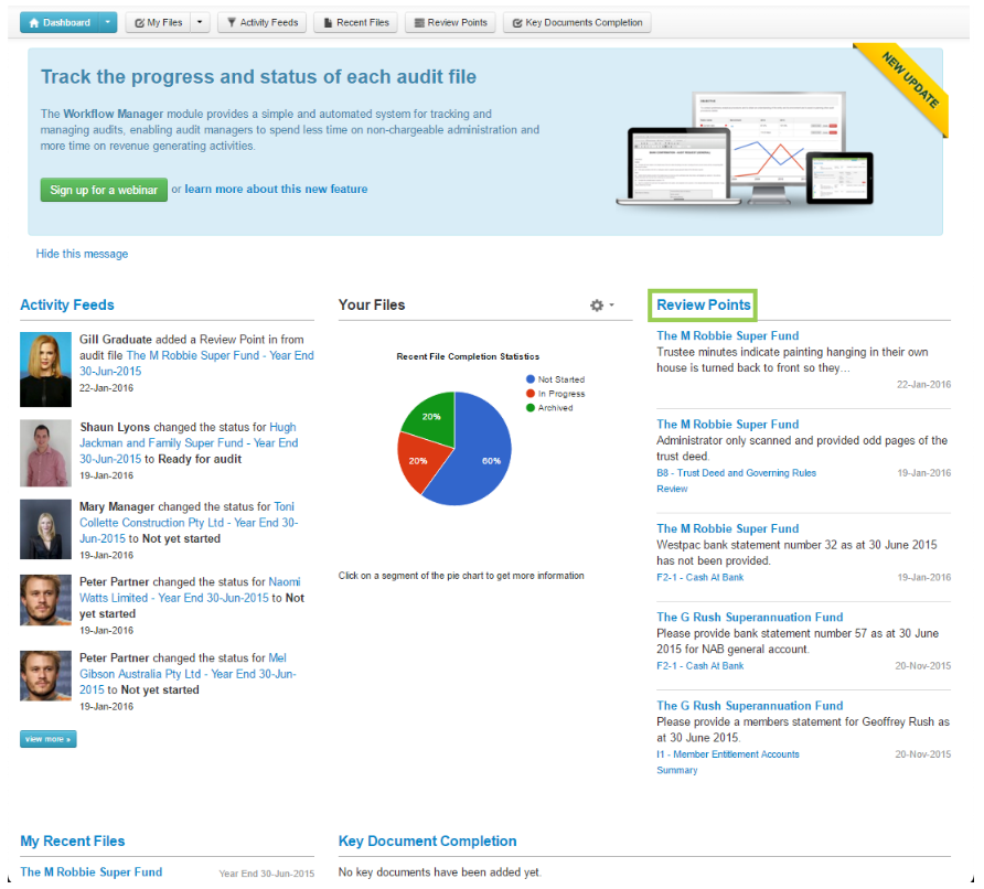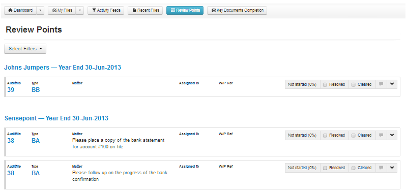 The widget on the Dashboard provides you with a snapshot of the five most recent review points added to your engagement files. To access a listing of all your unresolved review points simply click on the Review Points heading, or click on the Review Points tab located on the top navigation bar.