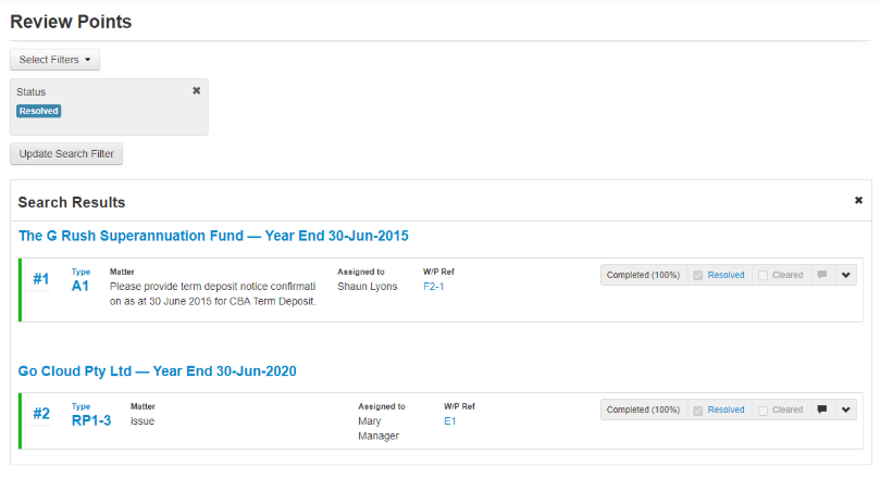 The Review Points widget is a live summary of all the unresolved review points on each file, which you have been assigned to as part of the engagement team, ensuring that all review points are attended to on every file.