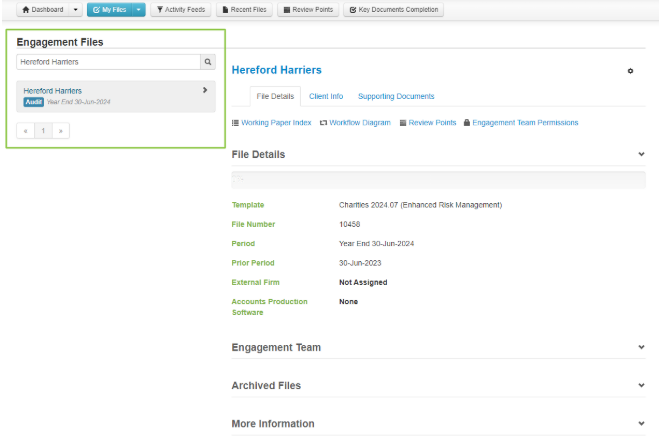 2. Search for the engagement file in which you would like to change the year-end date;