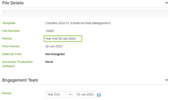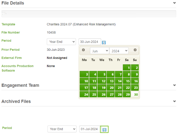 3. Under the File Details section, select the Period date. (Click on the actual date). This will then open up the date to be changed. Once you have selected the new year end date, hit the save button. Please see the step-by-step screenshots below;