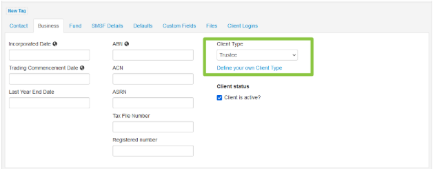 - In the Business tab select Trustee from the Client Type drop down menu;