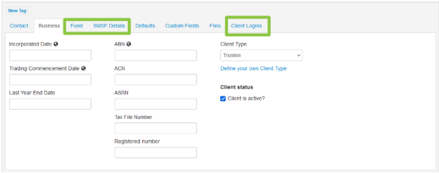 - Populate details in the Fund, SMSF Details and Client Logins tabs. For more information on creating Client Logins see here.