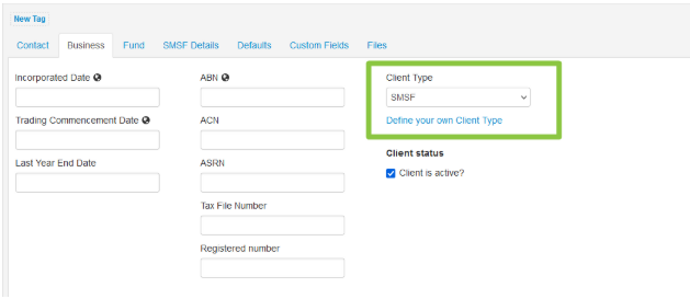 - In the Business tab select SMSF from the Client Type drop down menu;