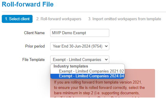 You now have the option to roll the file forward into the the Exempt Limited Companies 2024.04 template;