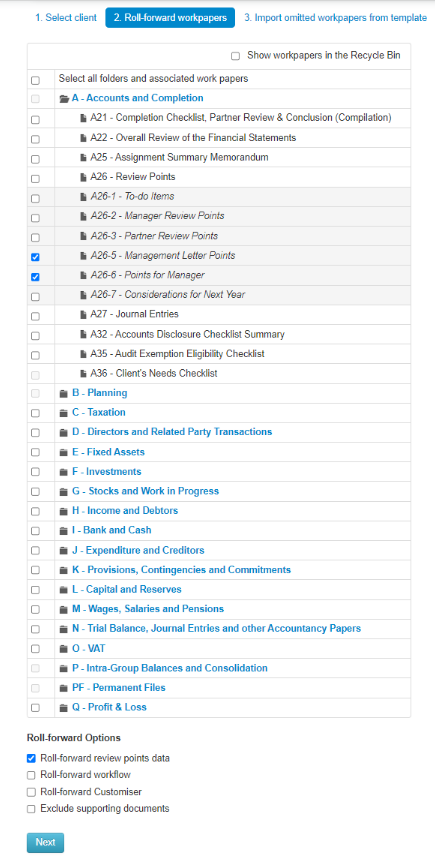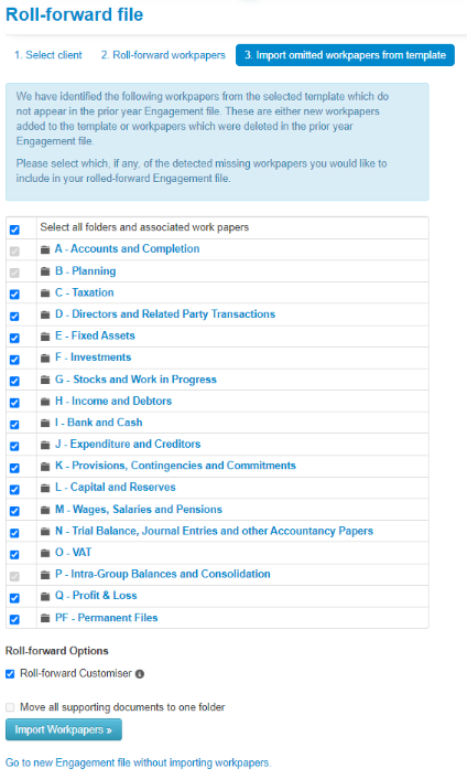 We recommend using the “Select all folders and associated workpapers” option at this point. Please also ensure that the "Roll-forward Customiser" box at the bottom of the page is ticked.
