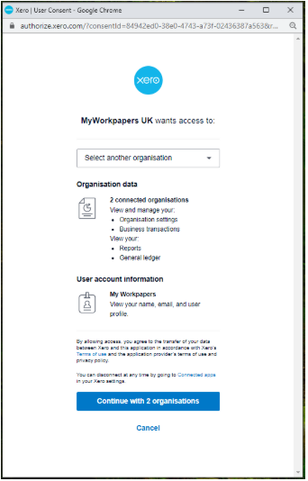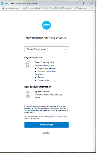 Note: Where applicable, you may be required to enter a security code for Multi-Factor Authentication. - Select the Xero organisation you want to connect with and click "Allow access":