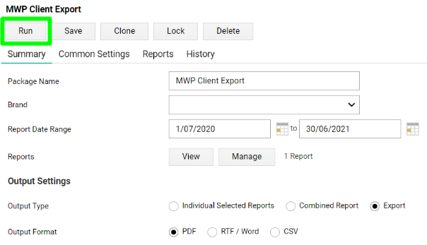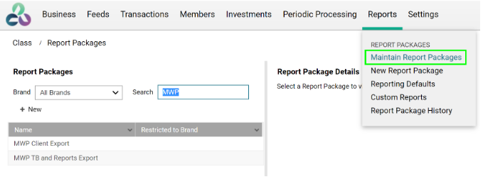 There should be a Report Package named "MWP Client Export" in the left-hand "Report Packages" list.