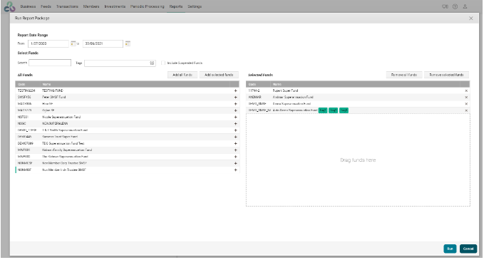 After you have selected the Report Package, click the “Run” button to display the fund selection screen.
