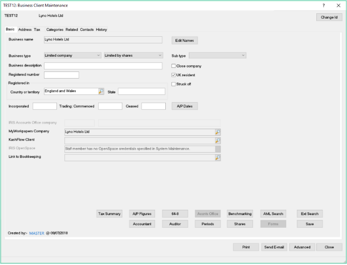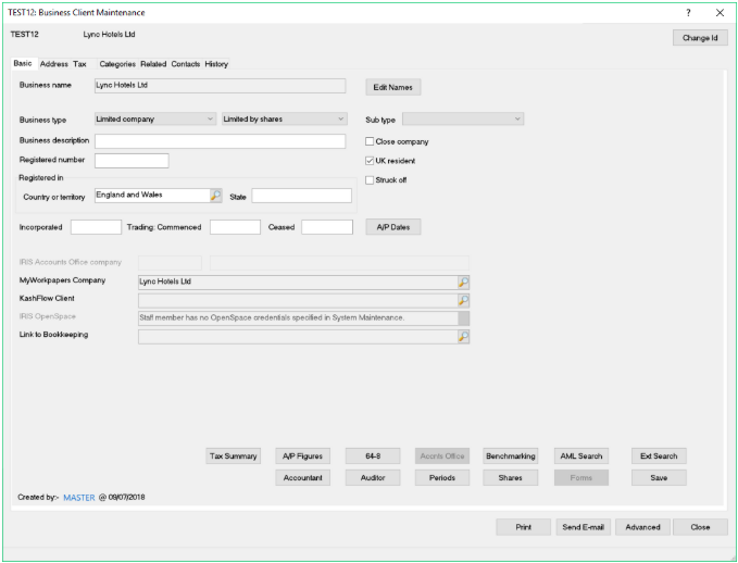 The Business Client Maintenance screen appears as follows: -
