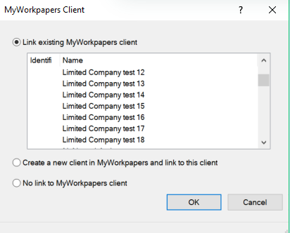 Depending on the option chosen, either select a MyWorkpapers client from the list, or click OK to let IRIS create a new MyWorkpapers client.