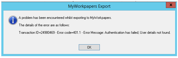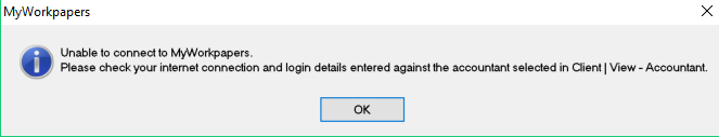 Note: The following error message will appear if MyWorkpapers login details have not been entered or are not valid in the Practice Options Please refer to the previous section of this guide.