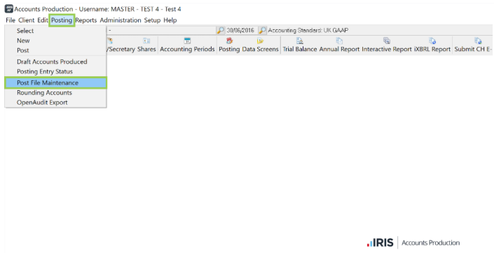 To reset the integration, return to IRIS Accounts Production and select Posting | Post file Maintenance | Entries