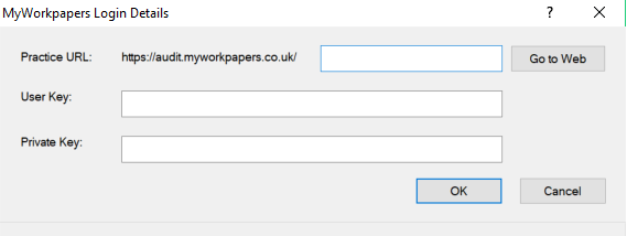 The MyWorkpapers Login Details screen appears as follows: - Complete the Practice URL field (The 'Practice URL' will be your firm username which is found at the same location as your User and Private Key)