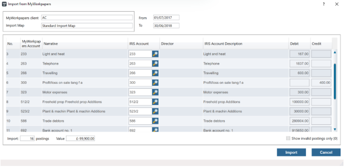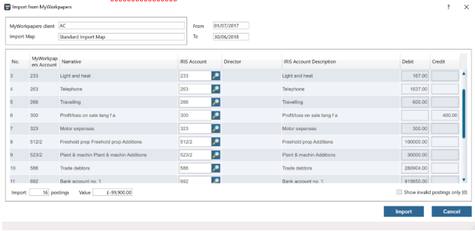 From this screen you’ll be able to check that all your entries are coded correctly and if need be you can amend these using the IRIS Account column. Once you’re happy to proceed click Import