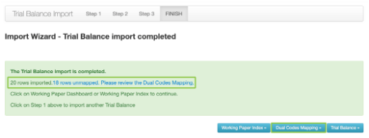 8. You will now be prompted that your Trial Balance has imported successfully. You will also be informed of how many of your rows have been auto mapped and unmapped. If you have rows unmapped, you can now select the "Dual Codes Mapper" button.
