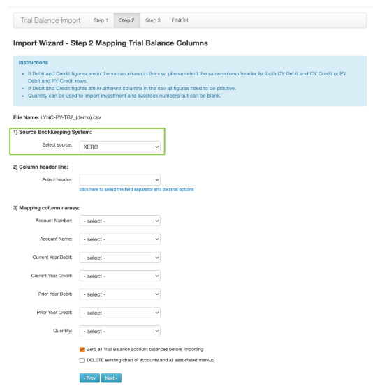 6. You will now select the Bookkeeping System in which your Trial Balance has been exported from. You can then complete the rest of the page and continue to the next page;