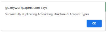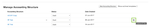 - Hover towards the right of the accounting structure you want to duplicate until you see the highlighted icon below. Select the icon and a message will display that the Accounting Structure has successfully duplicated;