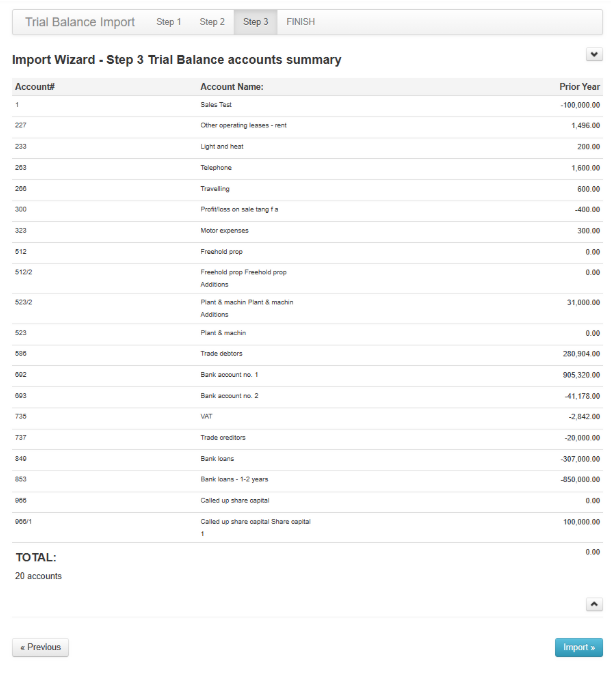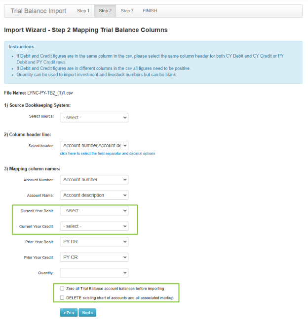 - In this step you need to ensure that the CY Debit & Credit fields are set to -Select- and that the PY Debit & Credit fields are mapped to the columns in your CSV file. Please ensure the "Source Bookkeeping System" is kept as -Select- and finally your import options are both unticked at the bottom and then press next.
