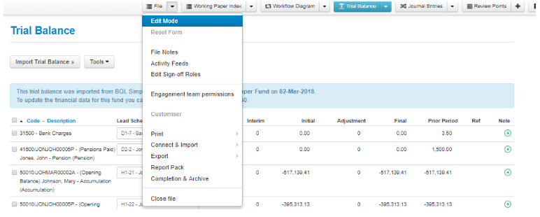 - In the trial balance select File "Edit mode";