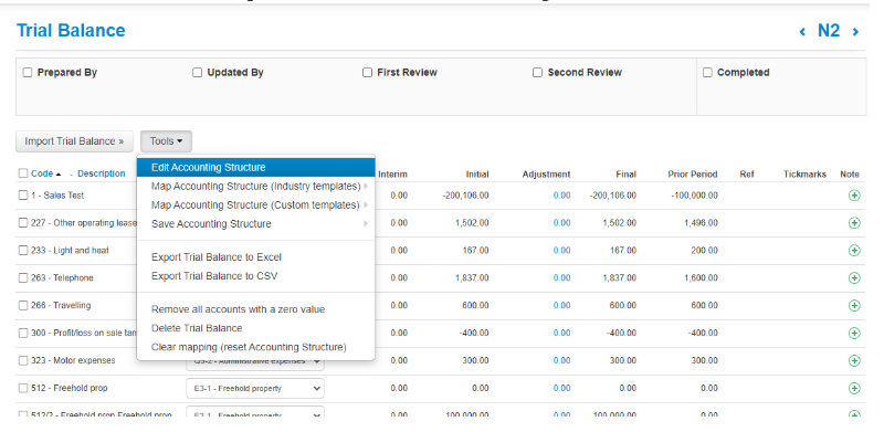 1. From within the Trial Balance, go into tools and enter edit accounting structure: