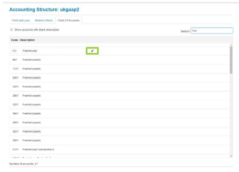 3. Locate the account description you wish to change. Hover your mouse over the description and select the pencil icon to the right;