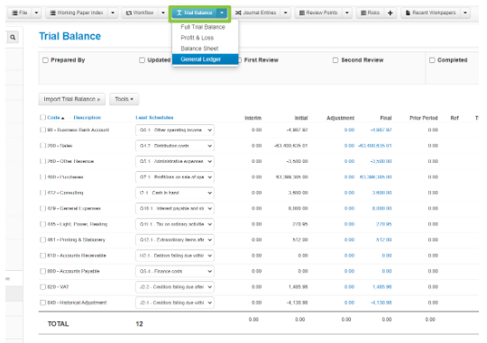 1. From within the client file, click on the Trial Balance dropdown and select General Ledger;