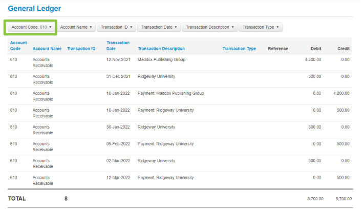 3. From the top of the page, you can filter the General Ledger by the following;