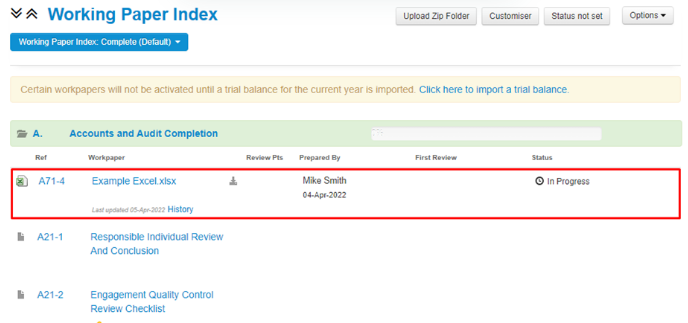 - Once you have copied the URL, return to your Working Paper Index, locate and click to open the supporting document you wish to hyperlink the workpaper within.