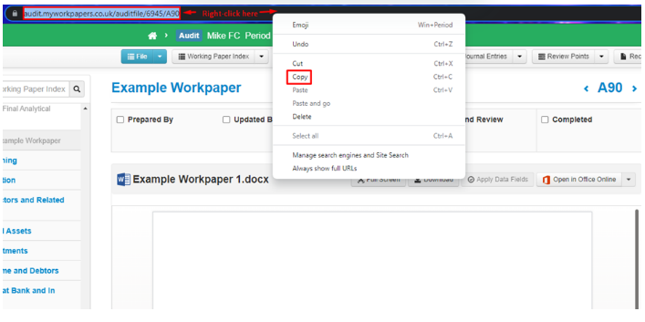 - Once you have the workpaper open, copy the URL in the top search bar of the browser – you can do this by simply right-clicking anywhere in the bar and choosing the copy option.