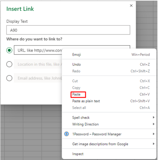 In the box below under the “Where do you want to link to?” is where you now paste the URL you copied before – you can do this by right-clicking inside the box and choosing the option paste.