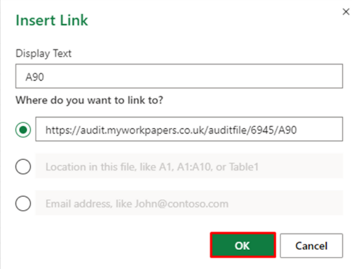 - In the Display Test box is where you put what you want the hyperlink to show as within the document – for example the reference of the workpaper being linked.