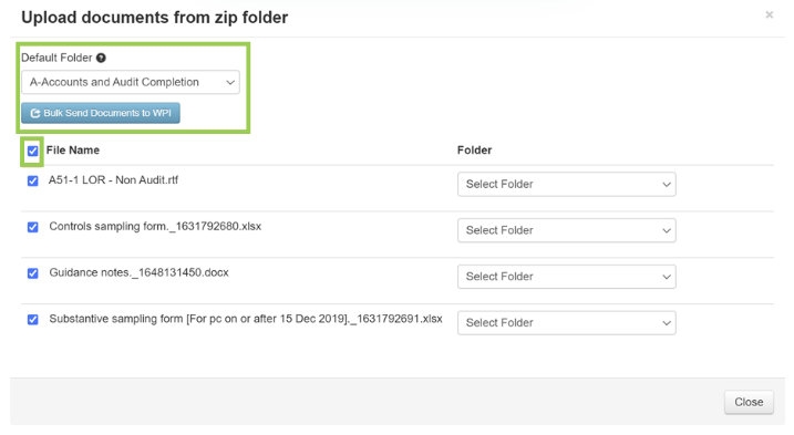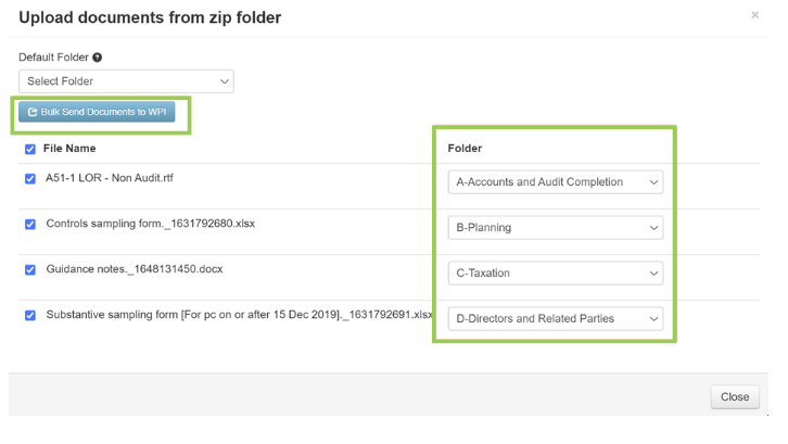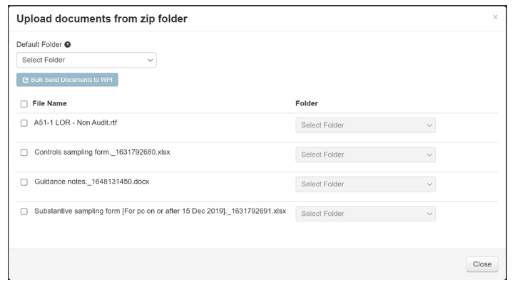 From here, you can either set a default folder for all the supporting documents to be sent to. Just ensure you hit the tick next to “File Name”, which will select all files, then select the default folder and hit the “Bulk Send Documents to WPI” button;