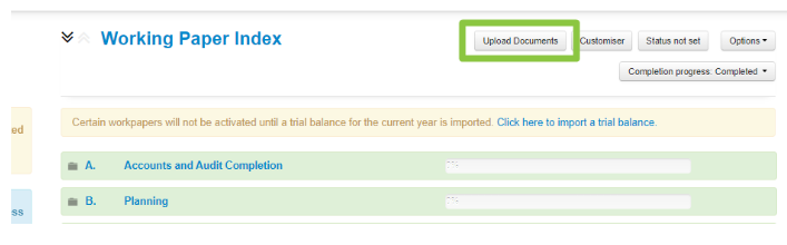 To upload a zip folder, firstly you will need to go into your Working Paper Index and click the “Upload Documents” button;