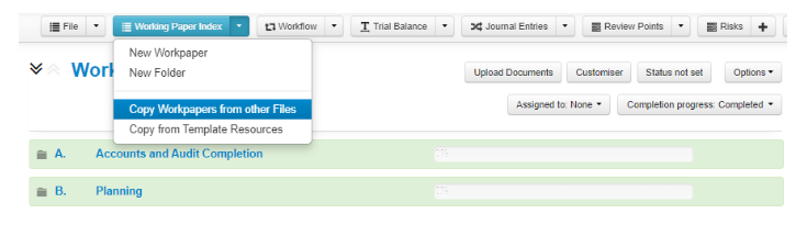 1. From inside the Working Paper Index, go to the Working paper Index drop-down and select “Copy Workpapers from other files”