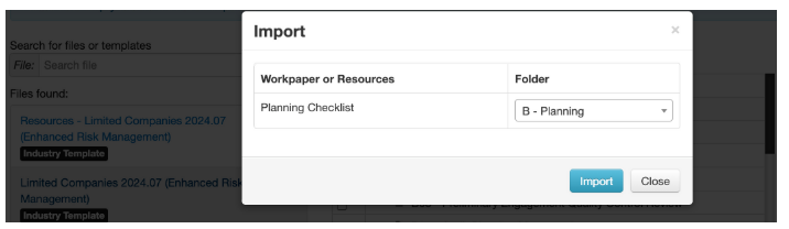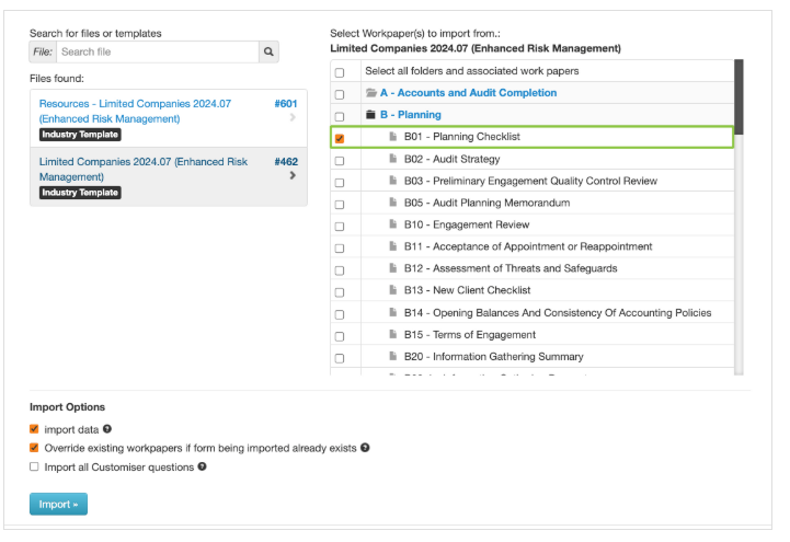 Override existing workpaper if the document being imported already exists – Tick to replace existing documents with the new document if a reference is already in use. For Example, if you rolled forward a file with an old Audit plan and needed to replace this with an updated version of the audit Plan. The old version will be replaced directly without the risk of duplicate audit plans within your file.