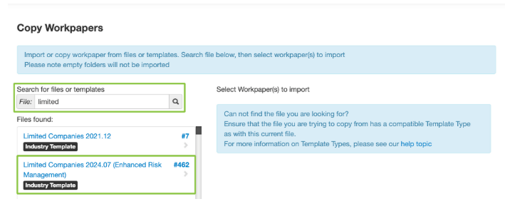 - Template name (You can search by a template name, for example, if you are working on a Limited Companies 16.0 template and would like an alternative version of an A32 FRS Checklist, you can search Limited Companies 16.0)