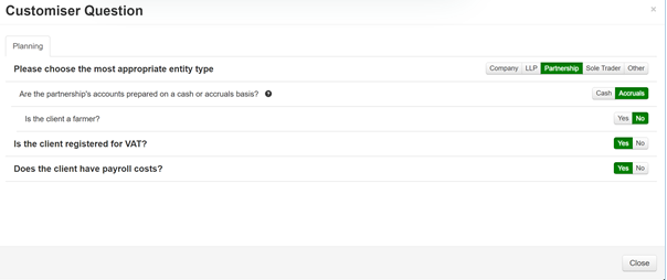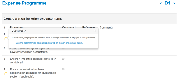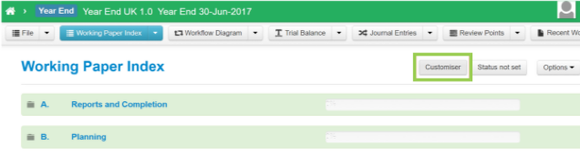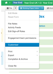 - The Customiser for Year-End Generic has a 'no' default response and only displays standard sections initially. Select a 'yes' response to activate applicable sections of the programmes and relevant workpapers;