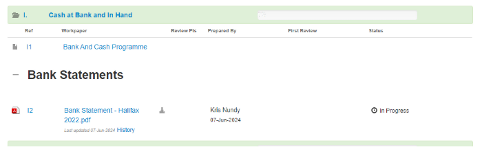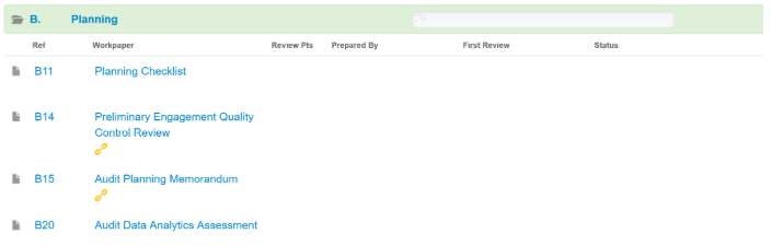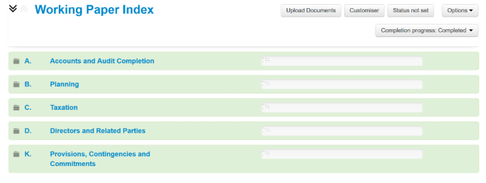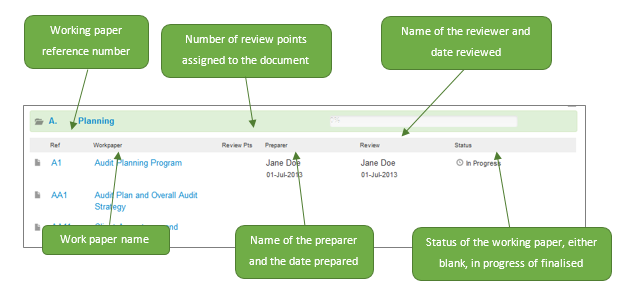 The Working Paper Index contains a series of folders which the respective areas of your engagement are stored, similar to a paper based file (e.g. planning, completion sections). Each folder is named and numbered for easy navigation and the programs, checklists and other documents contained in the folders can be accessed by simply clicking anywhere on the folder to expand it.