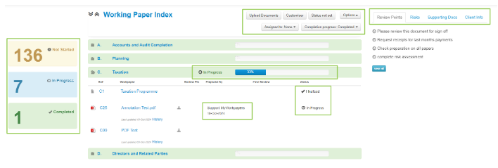 - Snapshot of Review Points, Risks, Supporting Documents and Client Info is found on the right-hand side of the Working Paper Index