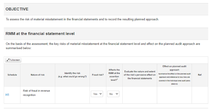Risk Assessment - This is where you will decide whether the risk needs to be in the RMM at Financial level table or RMM at the assertion level table