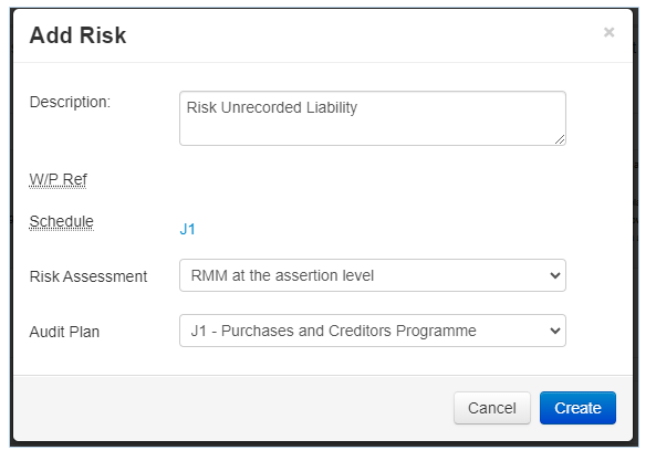 As with the financial statement level risk, we are now able to fill in the relevant columns in the table once the risk has been created. The biggest difference with assertion level risks is that this is where you can create the follow-up accounting estimates workpapers.