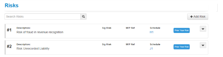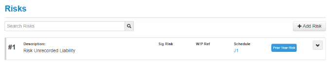 Once you have rolled forward a file, any risk created in the previous year will be rolled forward and labelled with a Prior Year Risk tag. This can be found by clicking on the Risks option at the top of the working paper index.